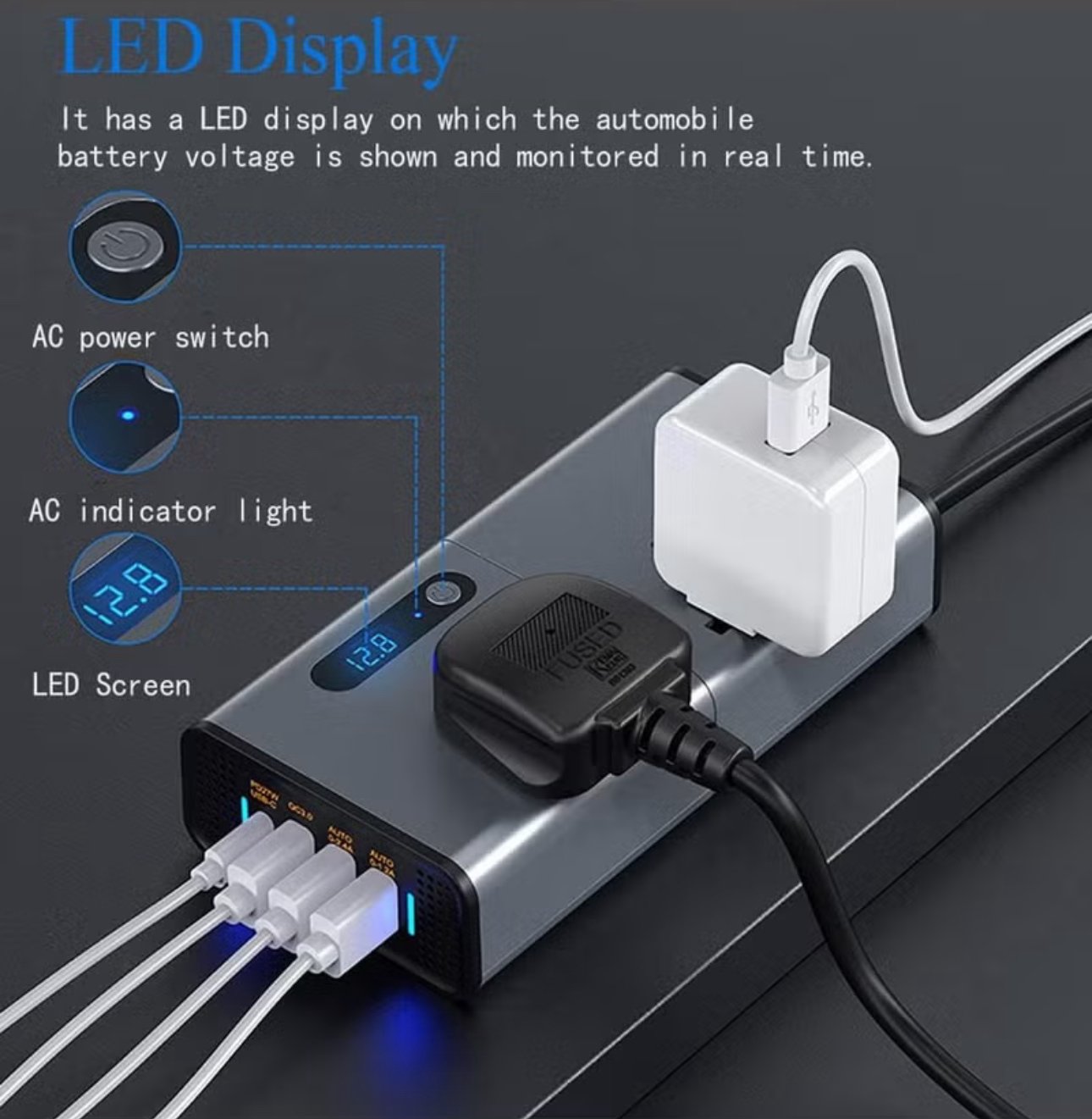 لشحن سيارتك، ويتميز بمنافذ تيار متردد مزدوجة 220 فولت وإجمالي 4 منافذ USB (2.4 أمبير USB، 1.2 أمبير USB، QC3.0، ونوع C) . يتيح لك هذا العاكس متعدد الاستخدامات شحن الهواتف والأجهزة اللوحية وأجهزة الكمبيوتر المحمولة الخاصة بك في وقت واحد مع توفير طاقة مستمرة من التيار المستمر إلى التيار المتردد. إن تصميم مقبس ولاعة السجائر يجعله مثاليًا للاستخدام مع مجموعة واسعة من الأجهزة الإلكترونية بما في ذلك الطائرات بدون طيار وكاميرات الفيديو والكاميرات الرقمية وأقراص DVD وما إلى ذلك.
