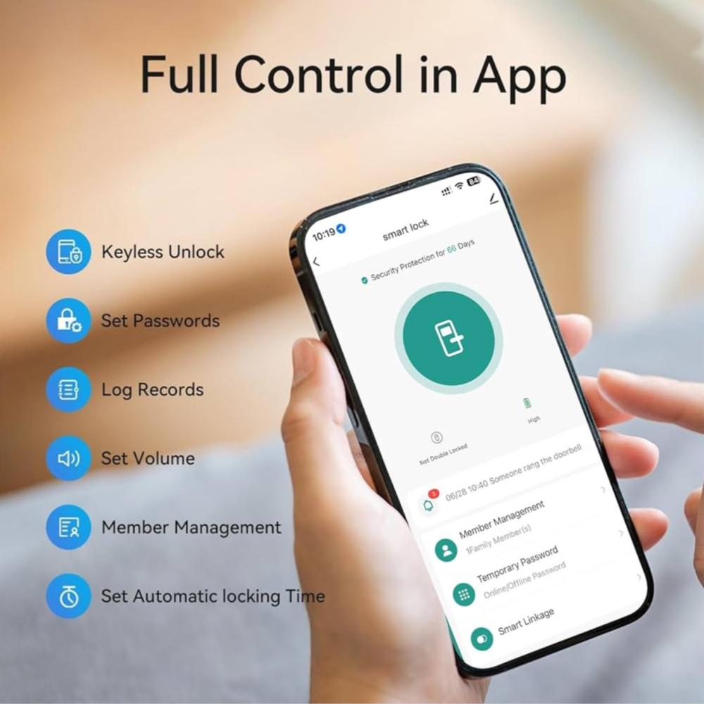 【سهولة الوصول وإدارة المراقبة عبر التطبيق】: تحكم في قفل الباب ببصمة الإصبع من خلال تطبيق الجوال عندما يرن جرس الباب. منح الوصول الدائم أو المؤقت لأفراد الأسرة، وإنشاء كلمات مرور لمرة واحدة للزوار عن بعد، ومراقبة كيفية ووقت فتح بابك. يتتبع التطبيق أيضًا محاولات التعليمات البرمجية الفاشلة ويوفر ميزات أمان إضافية.