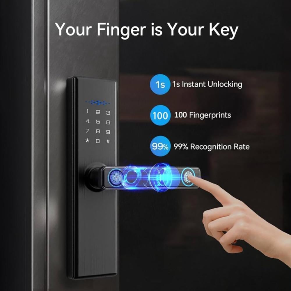 【طرق فتح القفل 5 في 1】: افتح الباب باستخدام بصمات الأصابع ورمز المرور والتطبيق ومفتاح التحكم عن بعد والمفتاح الميكانيكي. مع معرف بصمات الأصابع المباشر 360 درجة، يفتح الباب بلمسة واحدة فقط ويخزن ما يصل إلى 100 بصمة